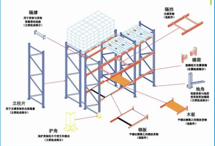 1.柱片以橫撐、斜撐以螺栓連接而成,柱片與抱焊粱插接組成貨架框架,采用主副架形式排列兩排,每個貨架組存放兩個單元(一個單元是一個托盤位);