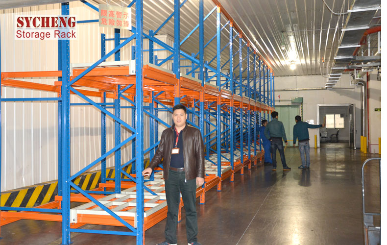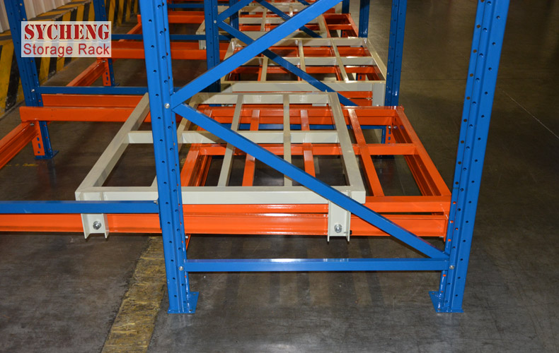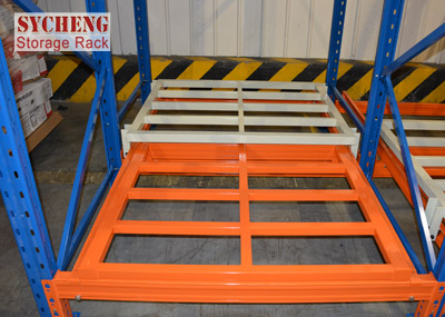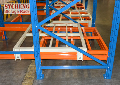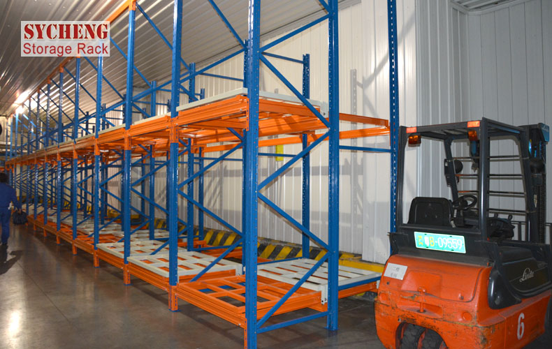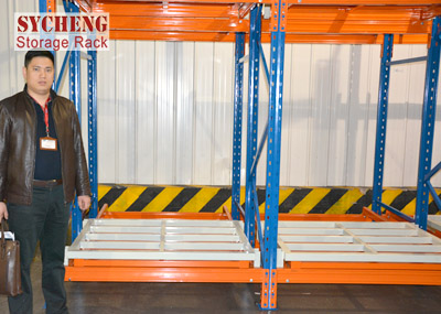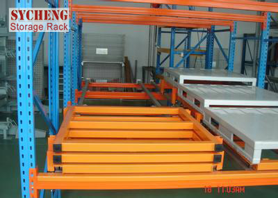 是使保管效率增加而設(shè)計(jì)的形式,其原理是在前后梁間以多層臺(tái)車重疊相撞,在貨架前端將貨物置于臺(tái)車上,后儲(chǔ)存貨物時(shí)叉車同時(shí)會(huì)將原先貨物推向里面。臺(tái)車通過(guò)軸承跨于傾斜軌道上,當(dāng)外側(cè)貨物被取走時(shí),里面的臺(tái)車會(huì)自動(dòng)滑向外側(cè)??梢砸?guī)劃儲(chǔ)位深度位2-4個(gè)棧板,最深可達(dá)5個(gè)棧板。