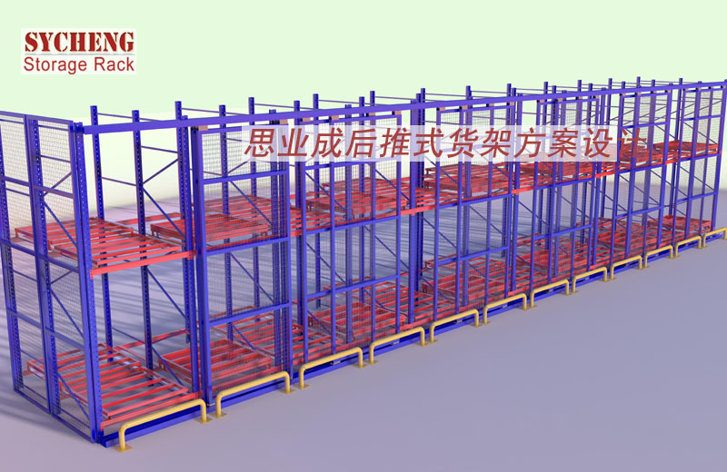 又名壓入式貨架——是在前后梁間以多層臺(tái)車重疊相接,從外側(cè)將疊棧貨物置于臺(tái)車推入,后儲(chǔ)存之貨品會(huì)將原先貨品推往里面。
