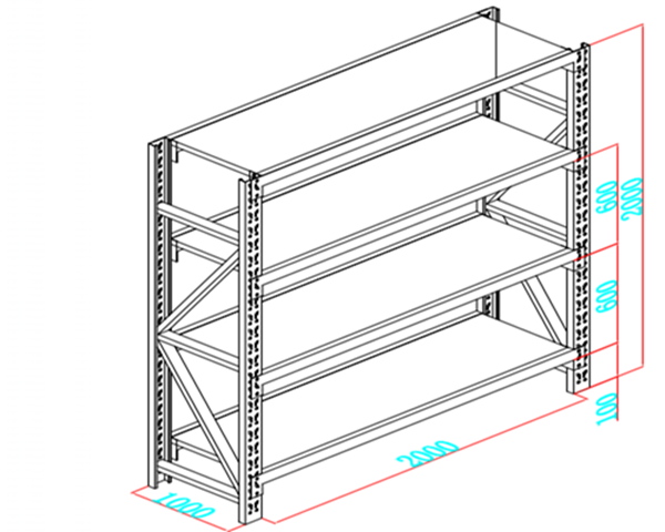 上圖是另外一個倉儲貨架的設(shè)計圖,圖中標(biāo)注了貨架長度1200mm,由圖中紅色劃線可以看出,該長度包含了兩邊立柱的規(guī)格,所以該長度是指倉儲貨架的外尺寸、外空、外徑。一般標(biāo)注該倉儲貨架的尺寸規(guī)格時可以這樣寫:1200(外)*500*2000mm,或者1200*500*2000mm。標(biāo)注外尺寸時可以注明是外尺寸也可以不標(biāo)注,不標(biāo)注時默認(rèn)為外尺寸,但倉儲貨架的長度是內(nèi)尺寸時是必須標(biāo)注的。